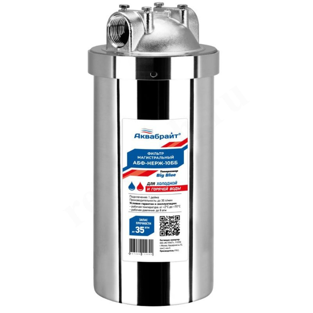 Магистральные фильтр серии - АБФ-НЕРЖ-ББ Магистральные фильтры типоразмера Big Blue серии АБФ-НЕРЖ изготовленные из нержавеющей стали, предназначены для очистки холодной и горячей воды и защиты сантехники от механических примесей, ржавчины, песка, ила, хлорорганических соединений, растворенного железа, тяжелых металлов, в зависимости от установленного в фильтр картриджа. Размер картриджа (высота) 10 дюймов Максимальное рабочее давление 8 атм Номинальное рабочее давление 2,5 атм Максимальная производительность 30 л/мин Диапазон температуры воды +2º +70º С Диаметр подключения 31 мм 1 дюйм Кронштейн и ключ в комплекте