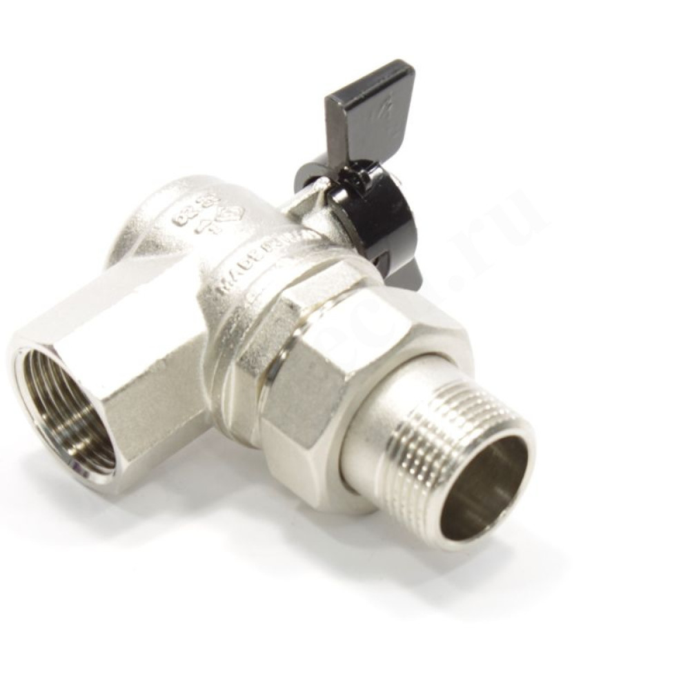 Кран шаровой латунный, угловой, полнопроходной, резьбы внутренняя по ISO 7:2000 - накидная гайка по ISO 228/1