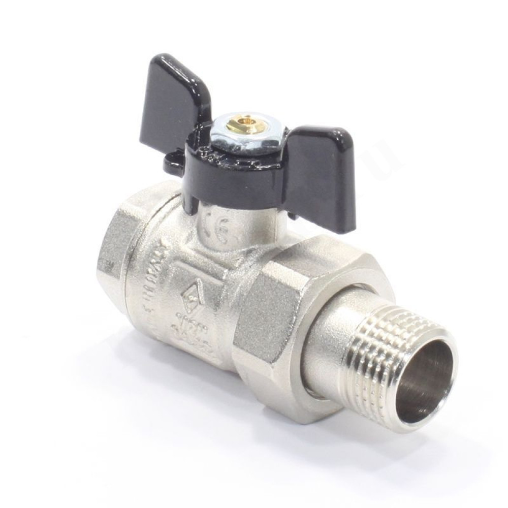 Кран шаровой латунный, полнопроходной, резьбы наружная - внутренняя с соединителем с накидной гайкой по ISО 228/1.,