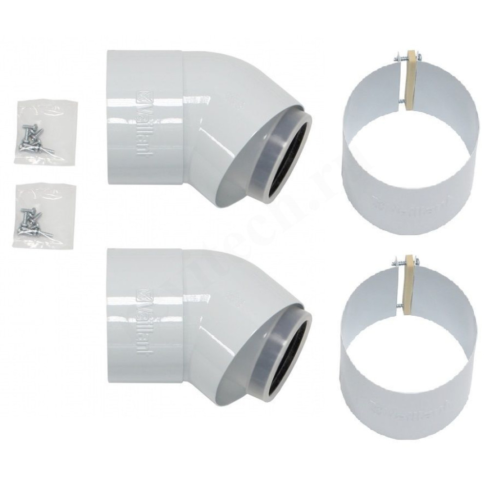 Колено 45° (2 шт.) для труб 80/125 мм для изменения конфигурации концентрического дымохода/воздуховода в комплекте с соединительным хомутом.