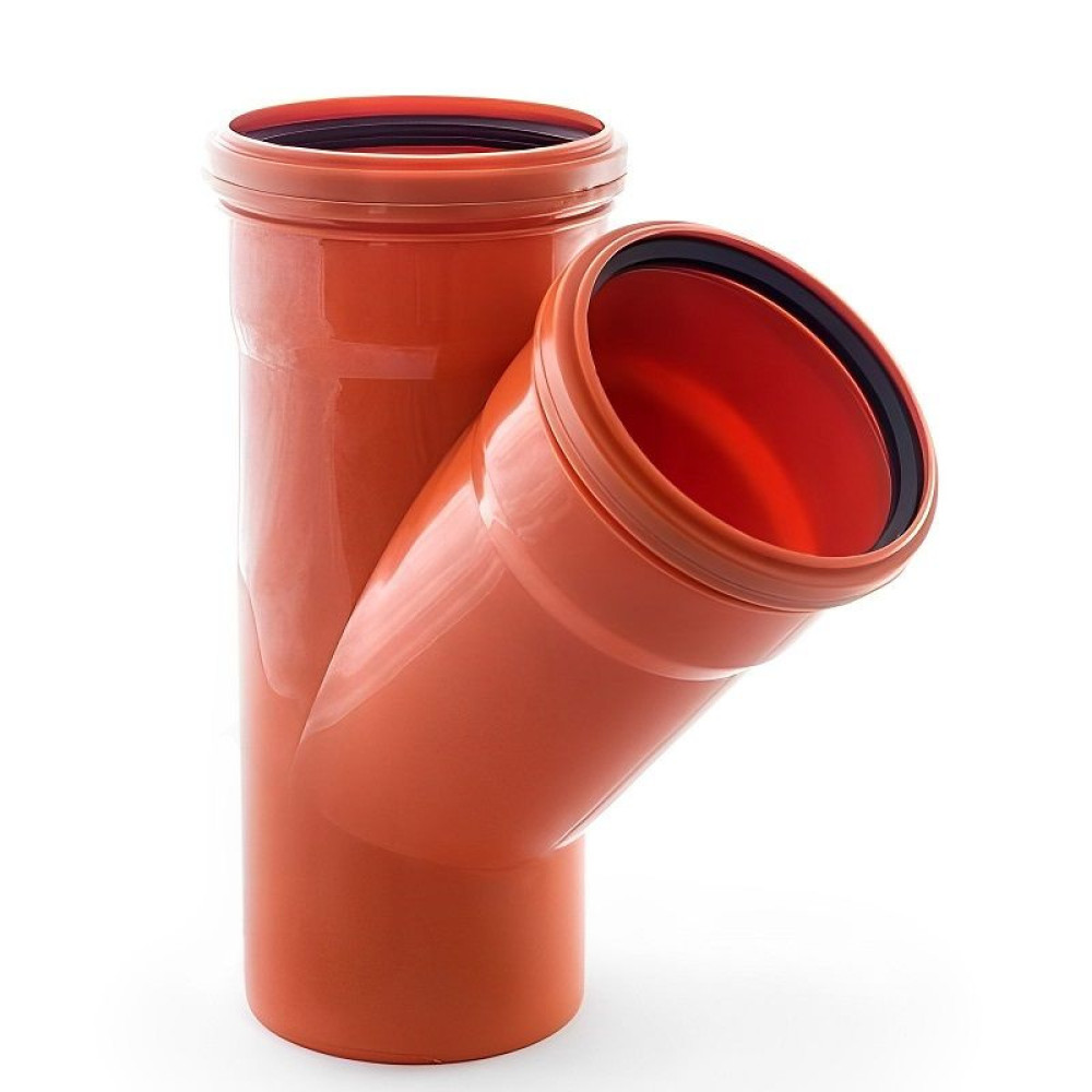 Тройник канализационный Ростурпласт для трубы диаметром 110 мм. Имеет выход под трубу диаметром 110 мм под углом 45 градусов. Применяется при монтаже систем наружной канализации.