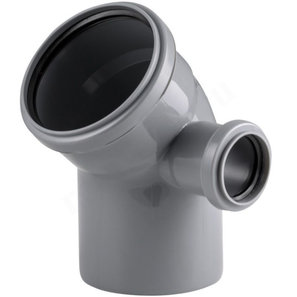 Отвод канализационный Ростурпласт диаметром 110 мм под углом 45 градусов для монтажа систем внутренней канализации. Имеет выход справа для трубы диаметром 50 мм.