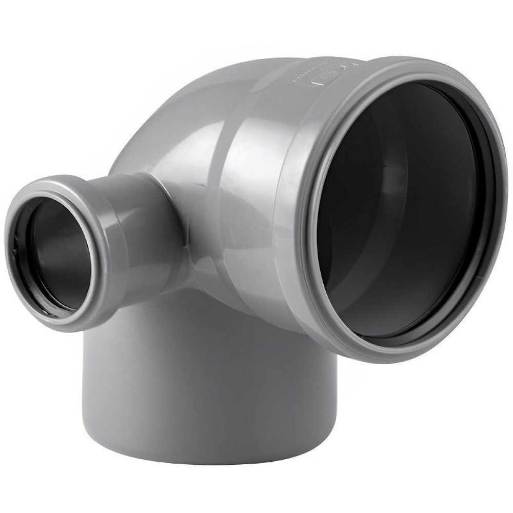 Отвод канализационный Ростурпласт диаметром 110 мм под углом 87 градусов для монтажа систем внутренней канализации. Имеет выход слева для трубы диаметром 50 мм.