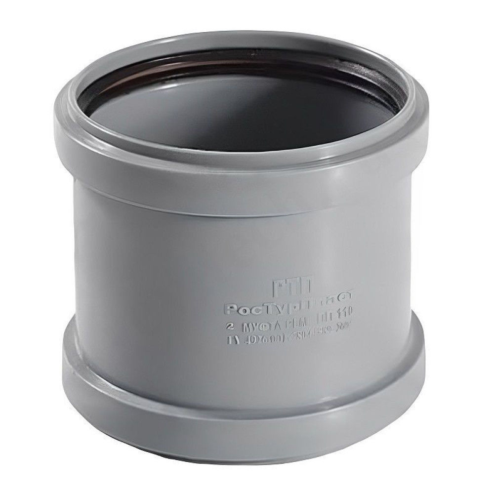Муфта канализационная надвижная Ростурпласт для соединения двух безраструбных труб диаметром 110 мм в случае их ремонта при монтаже систем внутренней канализации.
