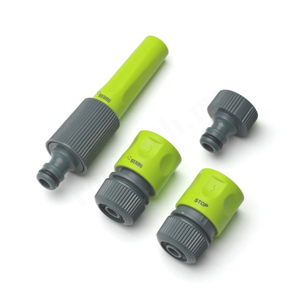 Состоит из переходника для подключения к крану (резьба 26,5 мм (3/4")) с переходником на резьбу 21 мм (1/2"), быстроразъемного соединения, заглушки-аквастоп и разбрызгивателя, совместимых со всеми представленными на рынке системами из пластика. Основной набор для шланга диаметром 13 мм (1/2") так же подходит для соединения шлангов диаметром 15 мм (5/8").