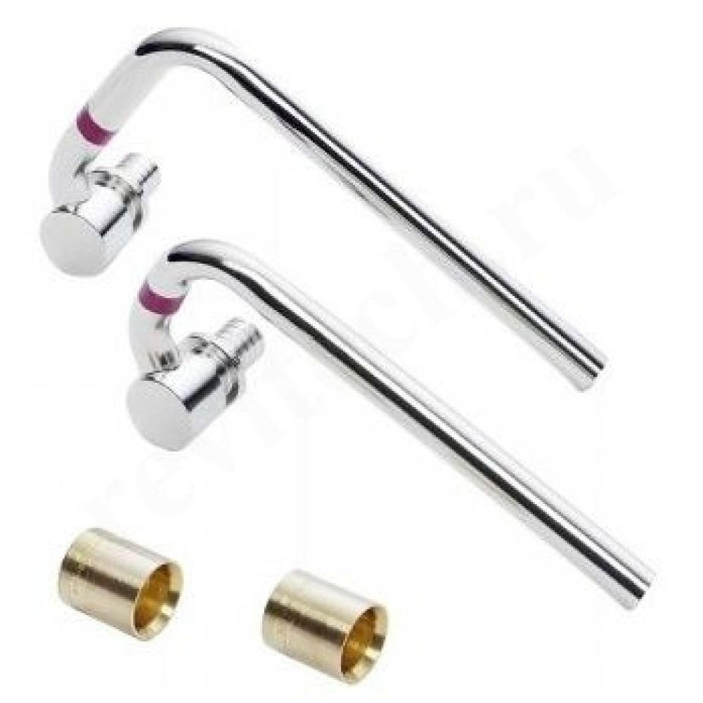 Отвод 12 мм для присоединения при помощи телескопического углового резьбозажимного соединения REHAU. 1 комплект поставки включает 1 концевой фитинг для подающей магистрали, 1 для обратной и 2 надвижные гильзы RAUTITAN MX.