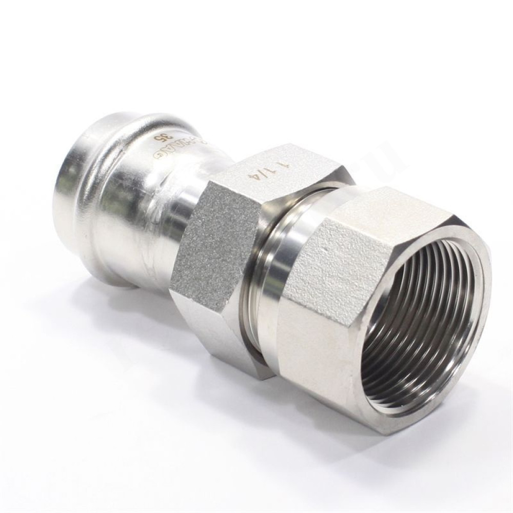 Американка из нержавеющей стали с внутренней резьбой обеспечивает соединение тонкостенной стальной трубы с резьбовым элементом монтируемой системы. Область применения – трубопроводы водоснабжения, отопления, иные инженерные и технологические установки с рабочей температурой до 120 °С и давлением до 16 бар. Фитинг изготовлен из стали AISI 304. Материал уплотнения – эластомер EPDM. Уплотнение EPDM, установленное в пресс-фитинг WAAG оснащено уникальным индикатором прессования, которое показывает неопрессованное соединение. Такое соединение будет не герметично (протекать) под давлением от 0,1 до 6,0 бар, поэтому при установке необходимо убедиться, что труба полностью вставлена в фитинг.