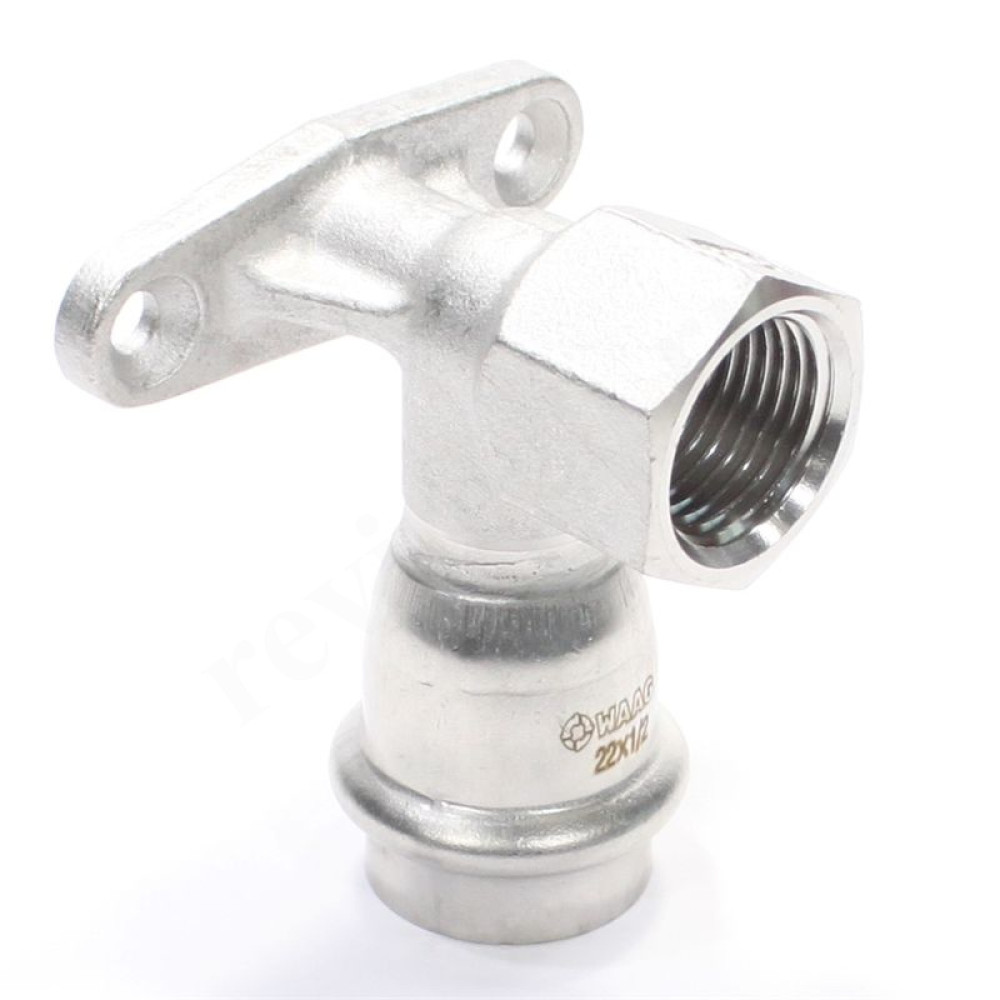 Пресс-угольник из нержавеющей стали с переходом на внутреннюю резьбу и креплением (водорозетка) обеспечивает соединение тонкостенной стальной трубы с резьбовым элементом (в частности, патрубком сантехнического смесителя) монтируемой системы под углом 90°. Область применения пресс-водорозетки из нержавеющей стали – трубопроводы водоснабжения, отопления, иные инженерные и технологические установки с рабочей температурой до 120 °С и давлением до 16 бар.