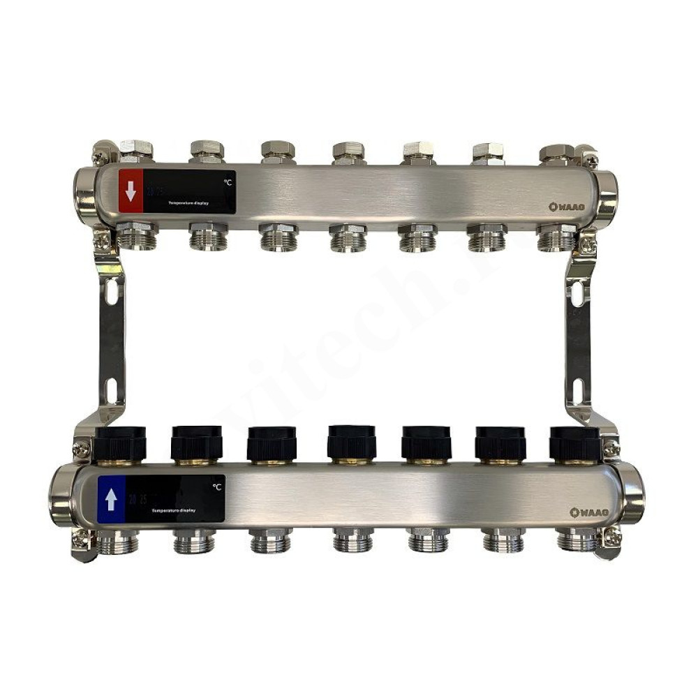 Коллекторный блок из нержавеющей стали служит для распределения потоков по контурам теплого пола, радиаторного отопления, прочих климатических систем, где в качестве теплоносителя используется вода либо незамерзающие растворы гликоля с максимальной рабочей температурой 90 °С, рабочим давлением до 9 бар.