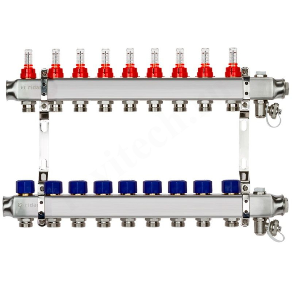 Коллектор Ридан SSM-RF 9 1"х3/4", 9вых., c клапанами, с расходомерами, сталь нерж., синий, в сборе