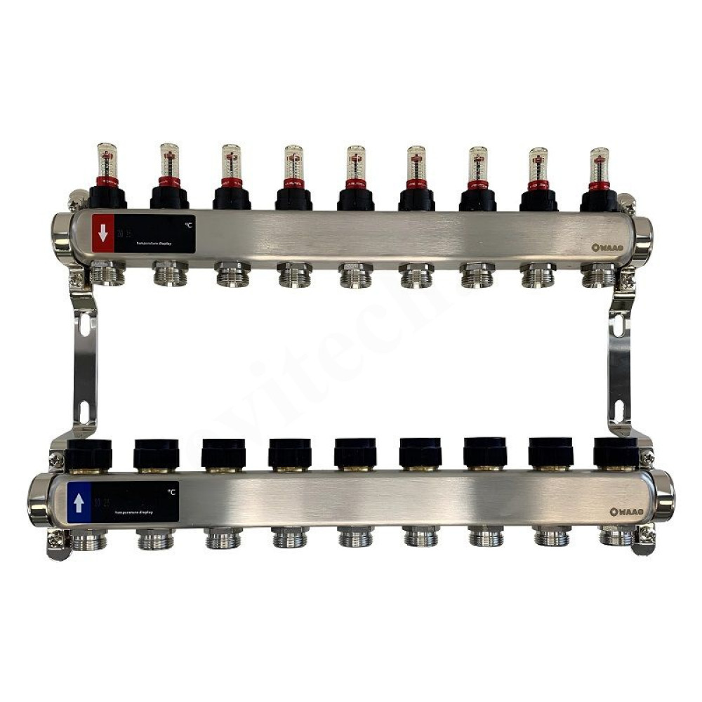 Коллекторный блок из нержавеющей стали служит для распределения потоков по контурам теплого пола, радиаторного отопления, прочих климатических систем, где в качестве теплоносителя используется вода либо незамерзающие растворы гликоля с максимальной рабочей температурой 90 °С, рабочим давлением до 9 бар. Выходы обратного коллектора блока оборудованы регулировочными клапанами с возможностью установки электротермических сервоприводов, подающего – настроечными клапанами с расходомерами (ротаметрами). Условный диаметр коллекторов – 1". Резьба выходов – наружная, 3/4".