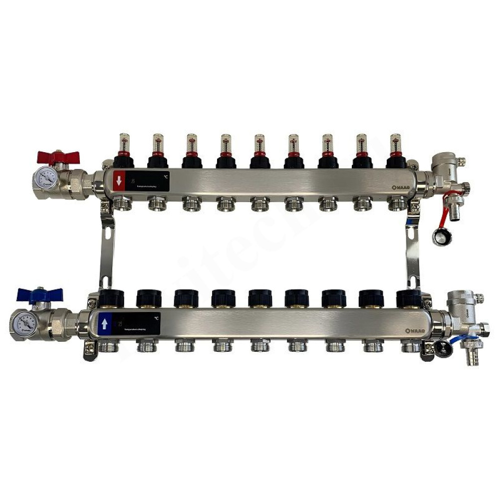 Коллекторный блок из нержавеющей стали служит для распределения потоков по контурам теплого пола, радиаторного отопления, прочих климатических систем, где в качестве теплоносителя используется вода либо незамерзающие растворы гликоля с максимальной рабочей температурой 90 °С, рабочим давлением до 9 бар.