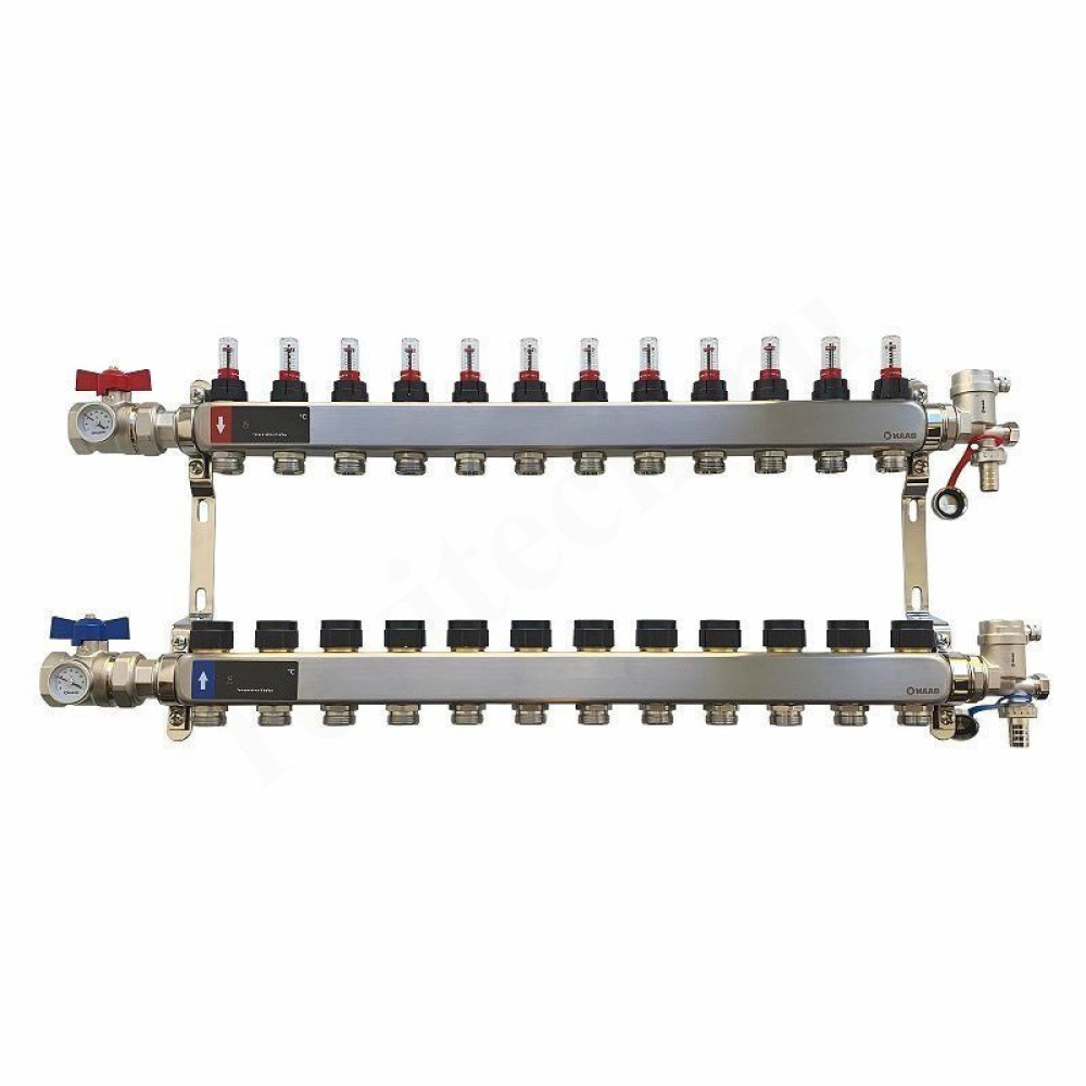 Коллекторный блок из нержавеющей стали служит для распределения потоков по контурам теплого пола, радиаторного отопления, прочих климатических систем, где в качестве теплоносителя используется вода либо незамерзающие растворы гликоля с максимальной рабочей температурой 90 °С, рабочим давлением до 9 бар.