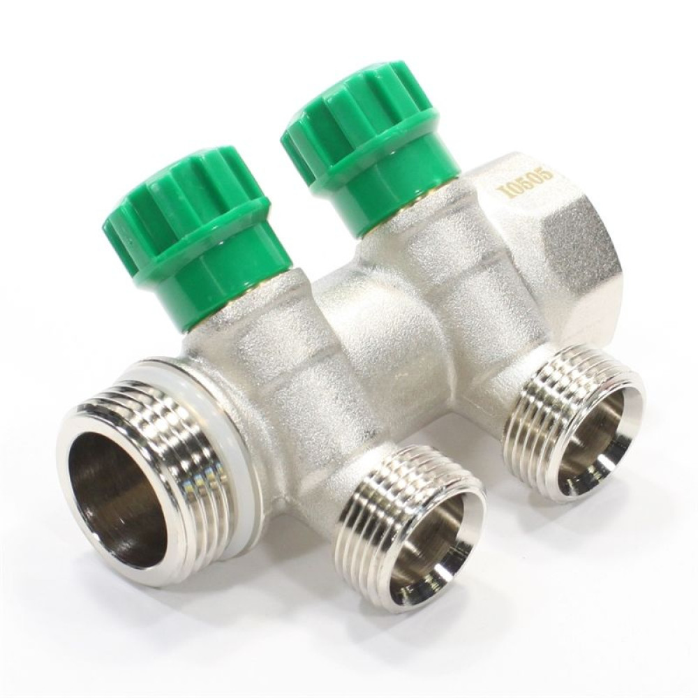 Латунный никелированный коллектор на 2, 3 и 4 выхода диаметром 3/4" с наружной резьбой, стандарт присоединения - «евроконус». На каждом выходе предусмотрен вентиль для регулирования расхода рабочей среды.