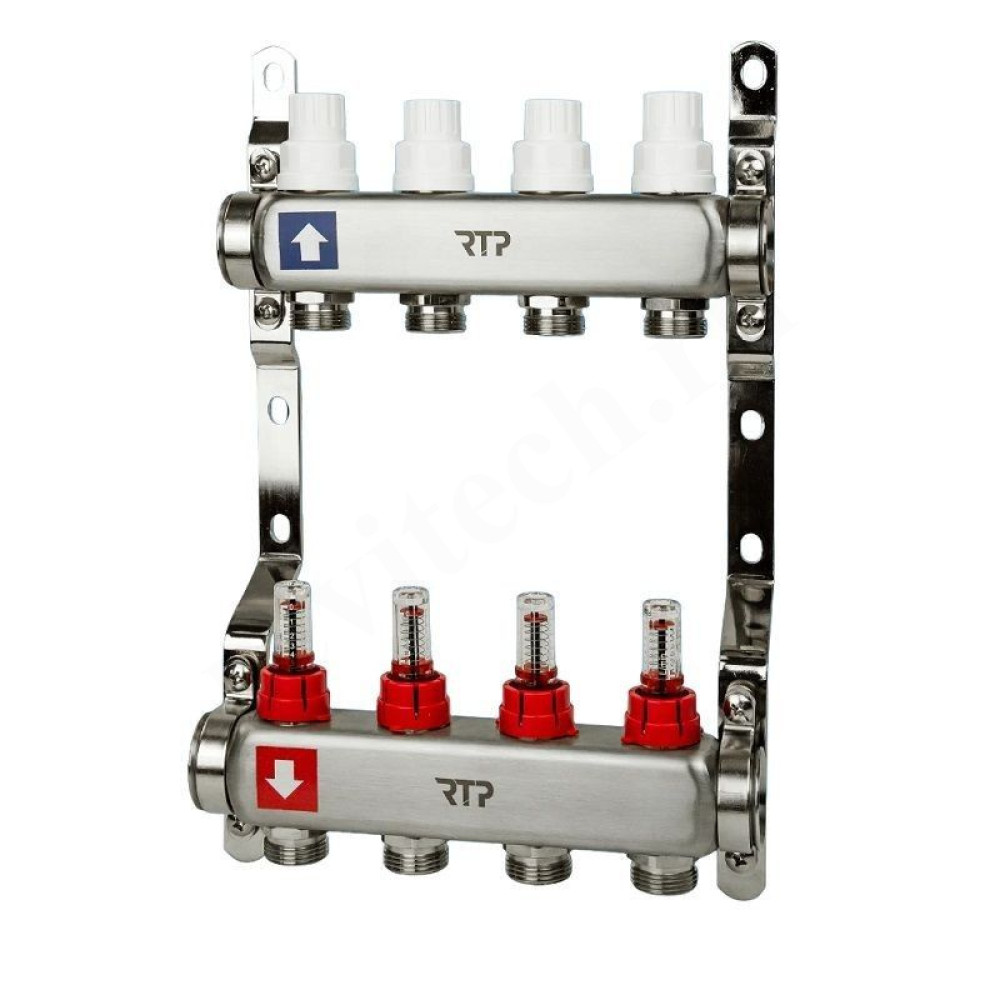 Коллекторная группа RTP с расходомерами и кронштейнами использутеся для систем отопления и водоснабжения. Изготовлена из нержавеющей стали SUS 304, что обеспечивает ее долговечность и устойчивость к коррозии.