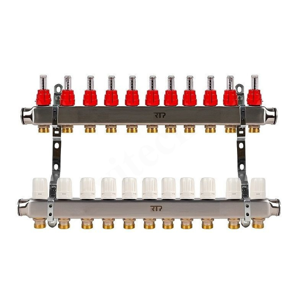 Коллектор RTP 1"х3/4", 11вых., c клапанами, с расходомерами, сталь нерж., белый