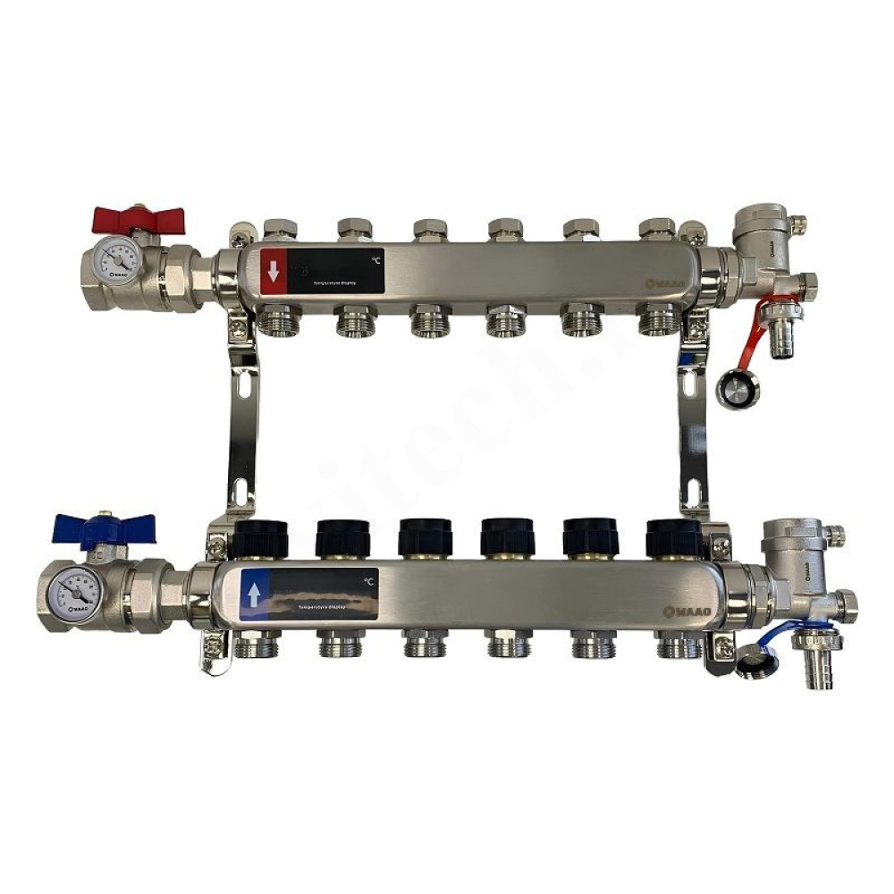 Коллекторный блок из нержавеющей стали служит для распределения потоков по контурам теплого пола, радиаторного отопления, прочих климатических систем, где в качестве теплоносителя используется вода либо незамерзающие растворы гликоля с максимальной рабочей температурой 90 °С, рабочим давлением до 9 бар. Выходы обратного коллектора блока оборудованы регулировочными клапанами с возможностью установки электротермических сервоприводов, подающего – настроечными микрометрическими клапанами. В комплекте: коллектор, воздухоотводчик, кран шаровой с манометром, крепление, упаковка
