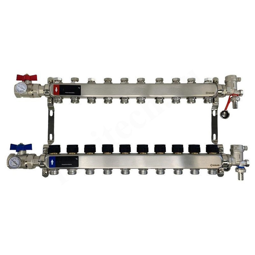 Коллекторный блок из нержавеющей стали служит для распределения потоков по контурам теплого пола, радиаторного отопления, прочих климатических систем, где в качестве теплоносителя используется вода либо незамерзающие растворы гликоля с максимальной рабочей температурой 90 °С, рабочим давлением до 9 бар.
