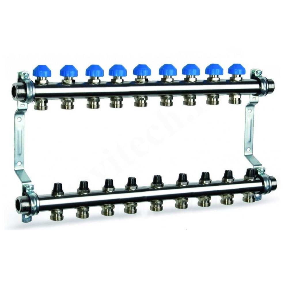 Коллектор 1" для напольного отопления, состоящий из двух патрубков из нержавеющей стали круглого сечения, смонтированных на звукоизолирующих кронштейнах. Возможность разностороннего подключения (1" hР с плоским уплотнением). Выходы: 3/4" НР с евроконусом, расстояние между отводами 55 мм. Минимальная величина заглубления при скрытом монтаже.