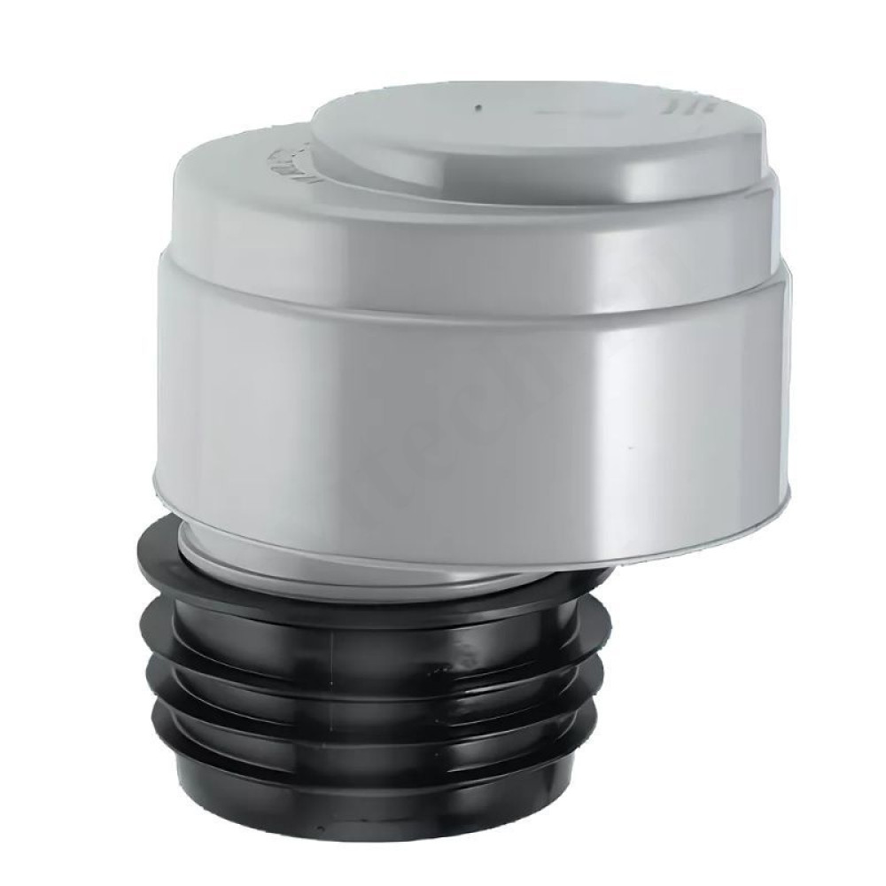 Вентиляционный клапан (аэратор) для канализации со смещением и прокладкой; выход вставляется внутрь 4"/110мм трубы; пропускная способность 45 л/сек. Применяется для подсоса воздуха в канализационную систему во время слива воды из прибора. Это исключает срыв водного затвора в сифонах и проникновение запахов в помещение. Монтаж производится с помощью специальной смазки. При отсутствии смазки - применять жидкое мыло.