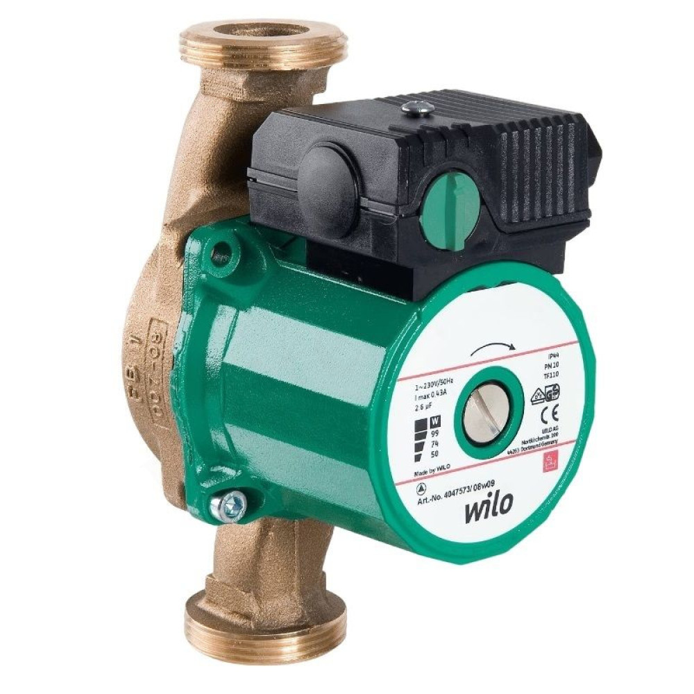 Циркуляционный насос для систем ГВС, насос с мокрым ротором с постоянной частотой вращения для установки в трубах. Устойчивый к токам блокировки электродвигатель. Корпус насоса из бронзы, рабочее колесо из упрочненного стекловолокном синтетического материала, керамический вал с угольными подшипниками скольжения, пропитанными синтетической смолой.