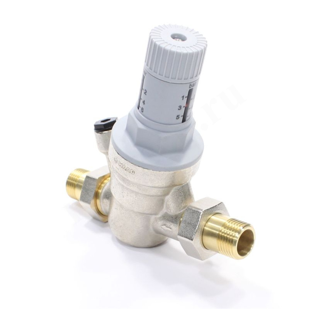 Патентованный редукционный мембранный клапан с оптимизированным седлом, регулятором выходного давления и шкалой для визуального контроля выходного давления. В комплекте с разъемными резьбовыми соединениями. Корпус и колпачок из латуни. Встроенный фильтр грубой очистки (сеточка из нержавеющей стали). Пластмассовое седло клапана. Макс. давление на входе 25 бар. Диапазон регулирования давления на выходе от 1,5 до 6 бар. Может использоваться для воды, воздуха и нейтральных газов с температурой до 30 °C. Уровень шума менее 20 дБ.