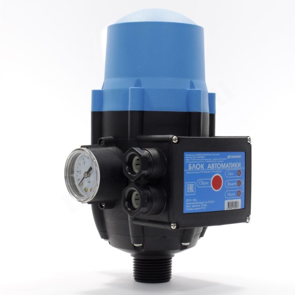 Блок автоматики осуществляет регулирование работы насоса по потоку и давлению. Блок автоматики снабжен манометром, монтируется в напорном трубопроводе или на выходе насоса. Блок автоматики производит запуск насоса при понижении величины давления в системе, и остановку насоса в случае прекращения потока жидкости. Автоматический оптимизированный режим работы насоса обеспечивает защиту от "сухого" хода и продлевает срок его эксплуатации. Максимальный коммутируемый ток - 10 А Стартовое давление - 1,5-3,5 атм. Максимальный поток воды - 80 л/мин Максимально допустимое давление - 10 атм. Резьба, дюйм G1
