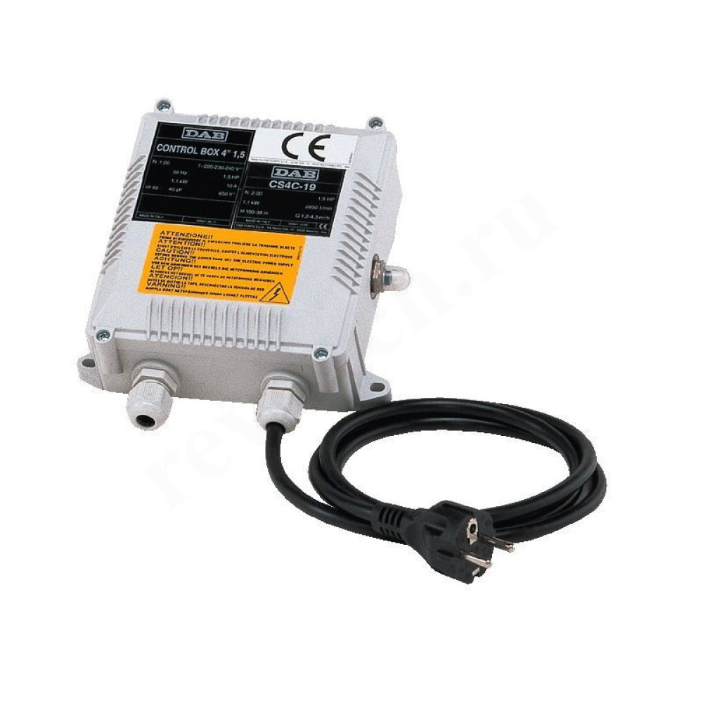 DAB CONTROL BOX - электрошкаф управления однофазными двигателями электронасосов, содержит сбрасываемую вручную защиту от перегрузки, конденсатор и клеммы для электрического соединения. В комплекте с клеммами для подключения реле давления/поплавкового выключателя при необходимости. В комплекте кабель 1,5 м и вилка SCHUKO CEE 7-VII UNEL 47166-68. Настенная коробка из самозатухающего термопластика.