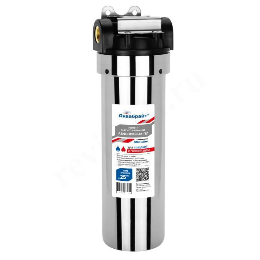 Магистральные фильтры для горячей воды серии АБФ-НЕРЖ-ПЛ Предназначены для очистки горячей и холодной воды, используемой для хозяйственных нужд. Эффективно удаляют растворенные и не растворенные примеси. Защищают бытовые приборы и сантехнику в квартире или доме. Преимущества фильтра: - Использование нержавеющей стали даёт возможность безопасно подключить фильтр к магистрали горячей воды. - Корпус из нержавеющей стали обладает привлекательным дизайном, на случай если его не удастся скрыть под раковиной или ванной. - Корпус фильтра АКВАБРАЙТ АБФ-НЕРЖ обладает повышенными характеристиками прочности и надёжности. Технические характеристики: - Типоразмер Slim Line 10" (h - 254 мм ± 1 мм) - Рабочая температура от +2° до +70° С - Максимальное давление 8 атм - Номинальное давление 2,5 атм - Производительность до 10 л/мин - Диаметр подключения 3/4 дюйма Комплектация: - Фильтр (корпус) - Кронштейн установочный - Саморезы для крепления - Ключ для смены картриджа - Инструкция и гарантийный талон