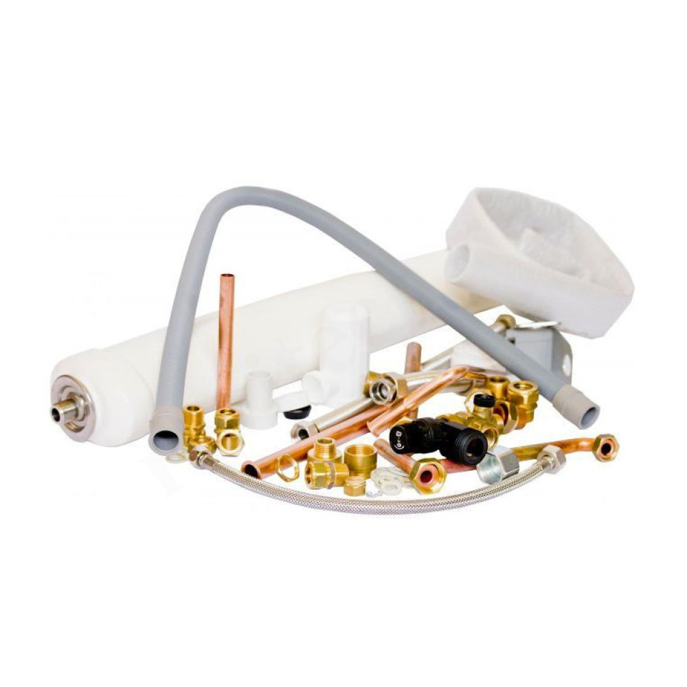 газовый кран, 3-х ходовой моторизированный клапан, шаровой кран холодной воды, температурный датчик бойлера, подводки для заполнения отопительного контура, фитинги и патрубки из меди для подключения к системе отопления, гофрированные подводки из нержавеющей стали, расширительный бак 4 л, фитинги и патрубки для подключения к бойлеру