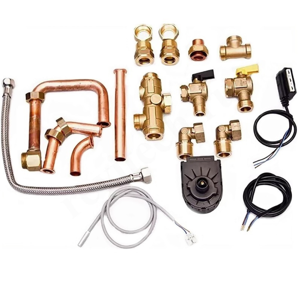 Газовый кран, 3-х ходовой моторизированный клапан, шаровой кран холодной воды, температурный датчика бойлера, подводки для заполнения отопительного контура
