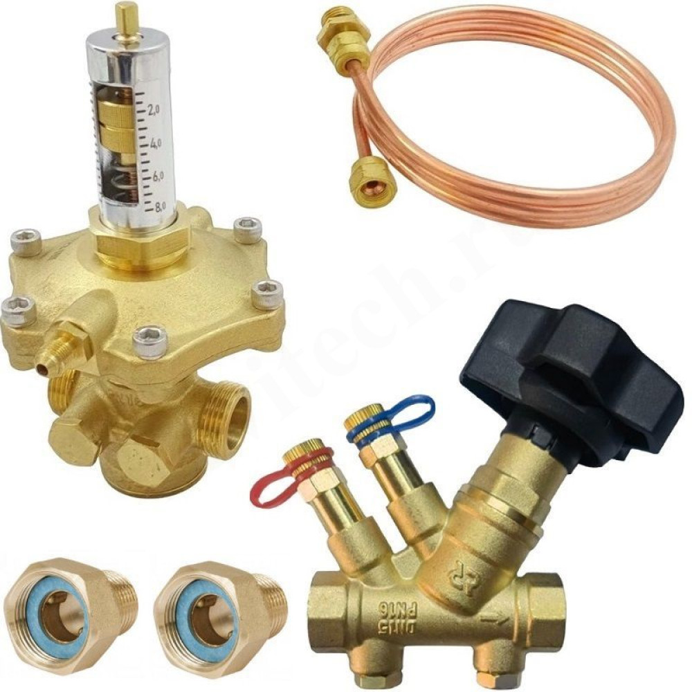 В комплекте: 1. APT-R клапан DN15 003Z5701R Клапаны балансировочные APT-R - регуляторы перепада давлений, предназначенные для гидравлической балансировки трубопроводных систем тепло- и холодоснабжения при переменных расходах проходящей через них среды в диапазоне от 0 до 100%. Не предназначены для контакта с питьевой водой в системах хозяйственно-питьевого водоснабжения. С использованием клапанов APT-R отпадает необходимость в сложной и продолжительной гидравлической наладке систем. Динамическая балансировка системы во всех режимах её работы позволяет улучшить комфорт в обслуживаемых помещениях и оптимизировать энергопотребление системы. 2. Резьбовые присоединительные фитинги для APT-R DN15 003Z0232R 3. MVT-R DN15 Ручной балансировочный клапан с дренажем 003Z4041R Клапаны MVT-R имеют функцию быстрого перекрытия потока и могут одновременно использоваться в качестве запорной арматуры. Клапаны оснащены игольчатыми измерительными ниппелями. Клапаны оснащены дренажными отверствия с резьбой 1/4', в которые можно подключать импульсную трубку от автоматического балансировочного клапана APT-R.