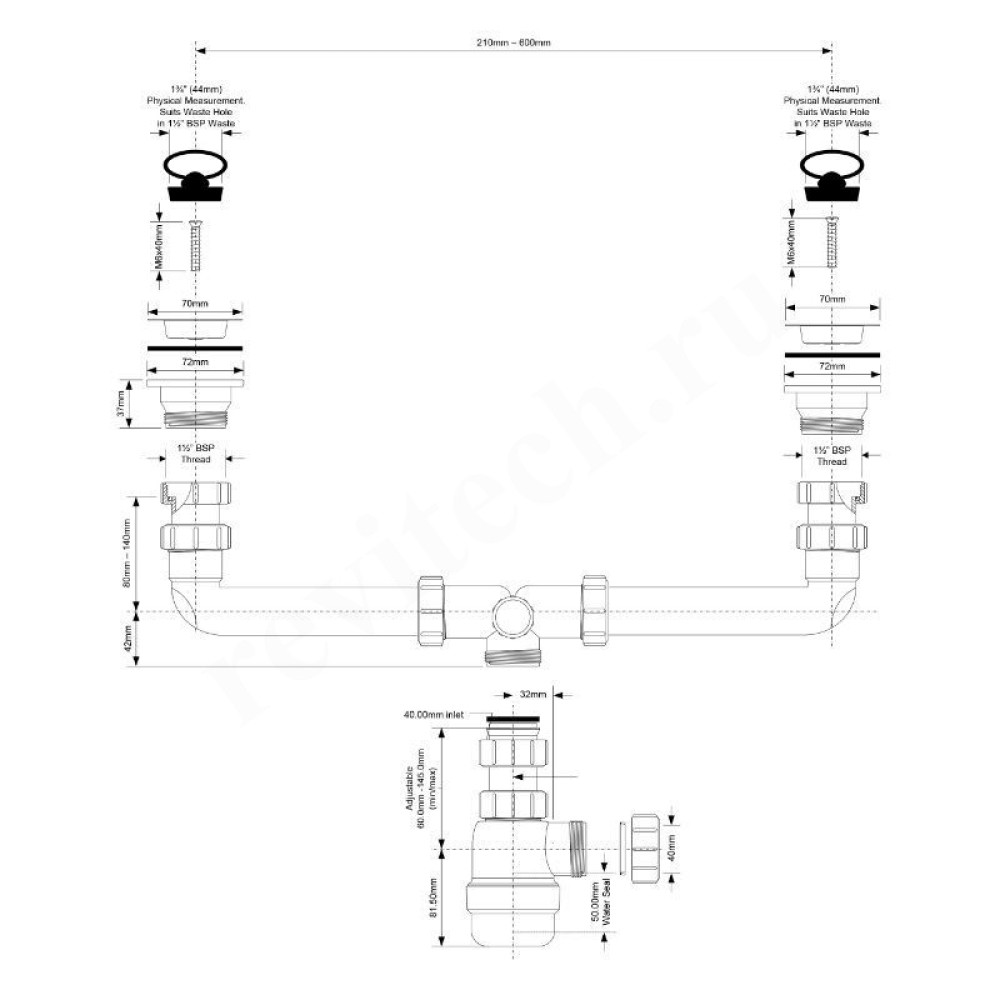 Сифон бутылочный (1 1/2'х40мм) для 2-х раковин с выпусками
