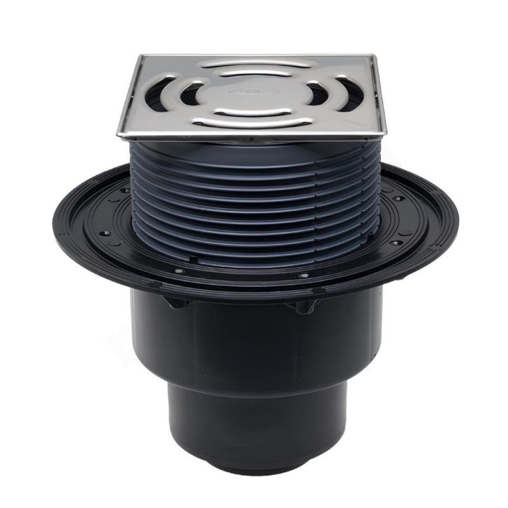 HL3100Pr – трап для внутренних помещений с вертикальным выпуском DN50/75/110, с надставным элементом из ПП, с решеткой 138х138 мм в подрамнике 145*145 мм из нержавеющей стали, с «сухим» сифоном «Primus».