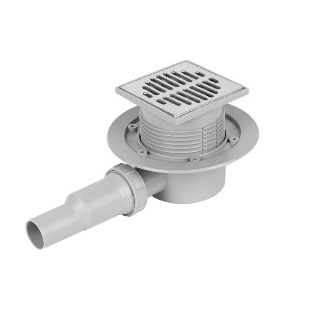 Трап (110ммх50/40мм) напольный с металлической (полированная нержавейка) решеткой 115ммх115мм и вставкой тип-"сухой гидрозатвор" (подпружиненная мембрана); высота 87-145мм; два выхода - компрессионный Ду=40мм и Дн=50/40мм, пакет