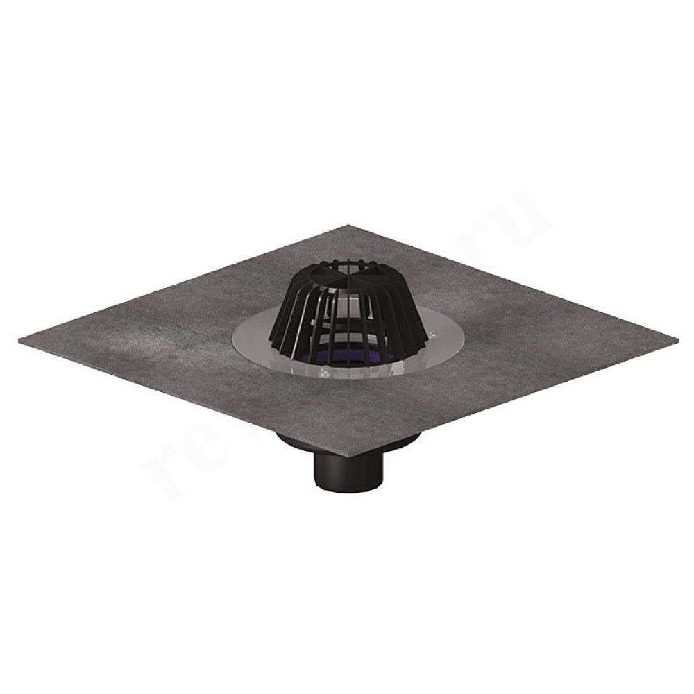 Кровельная воронка с вертикальным выпуском с листвоуловителем из ПП и с «фартуком» из гидроизоляционного полимербитумного полотна.