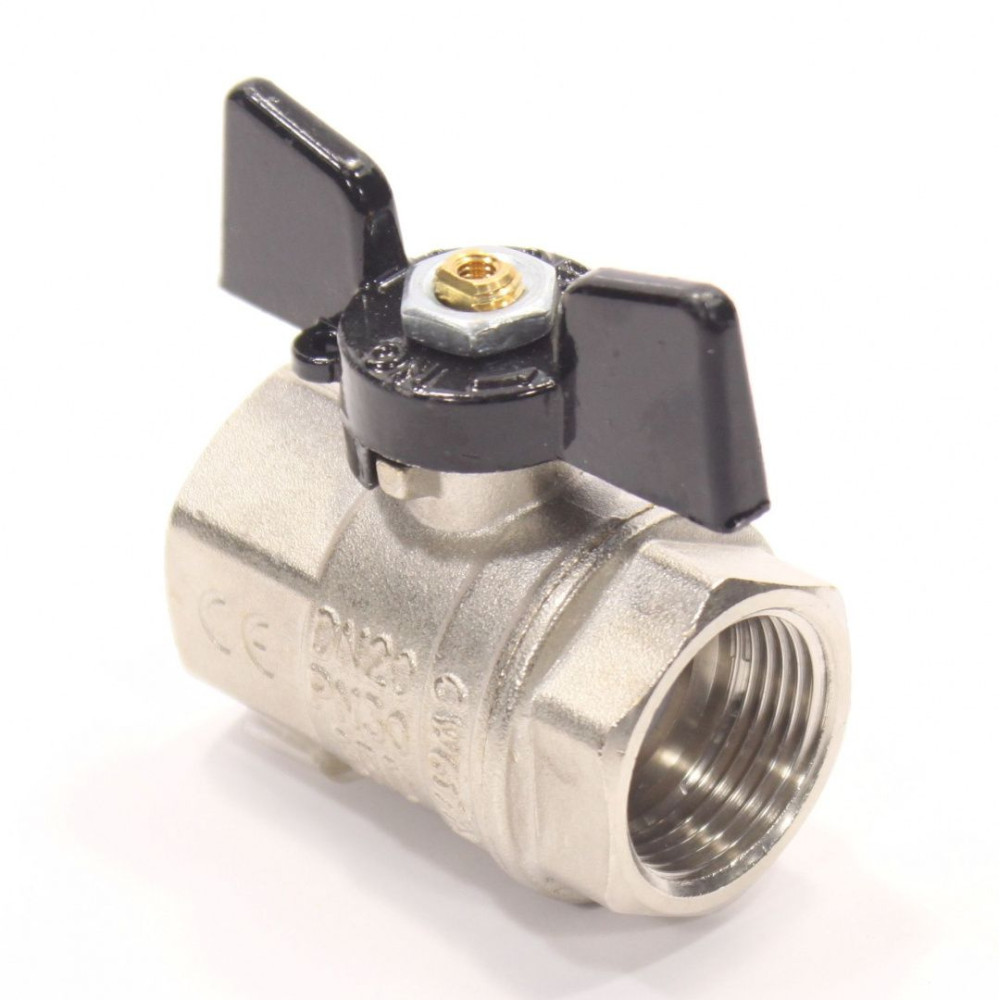 Кран шаровой латунный, полнопроходной, резьбы внутренняя - внутренняя по ISO 228/1 Ручка - "бабочка" из алюминия Корпус: латунь CW617N кованная, пескоструенный, никелированный Шар: латунь CW617N кованная, полированный хромированный Диапазон температур: от -20°C до +120°C