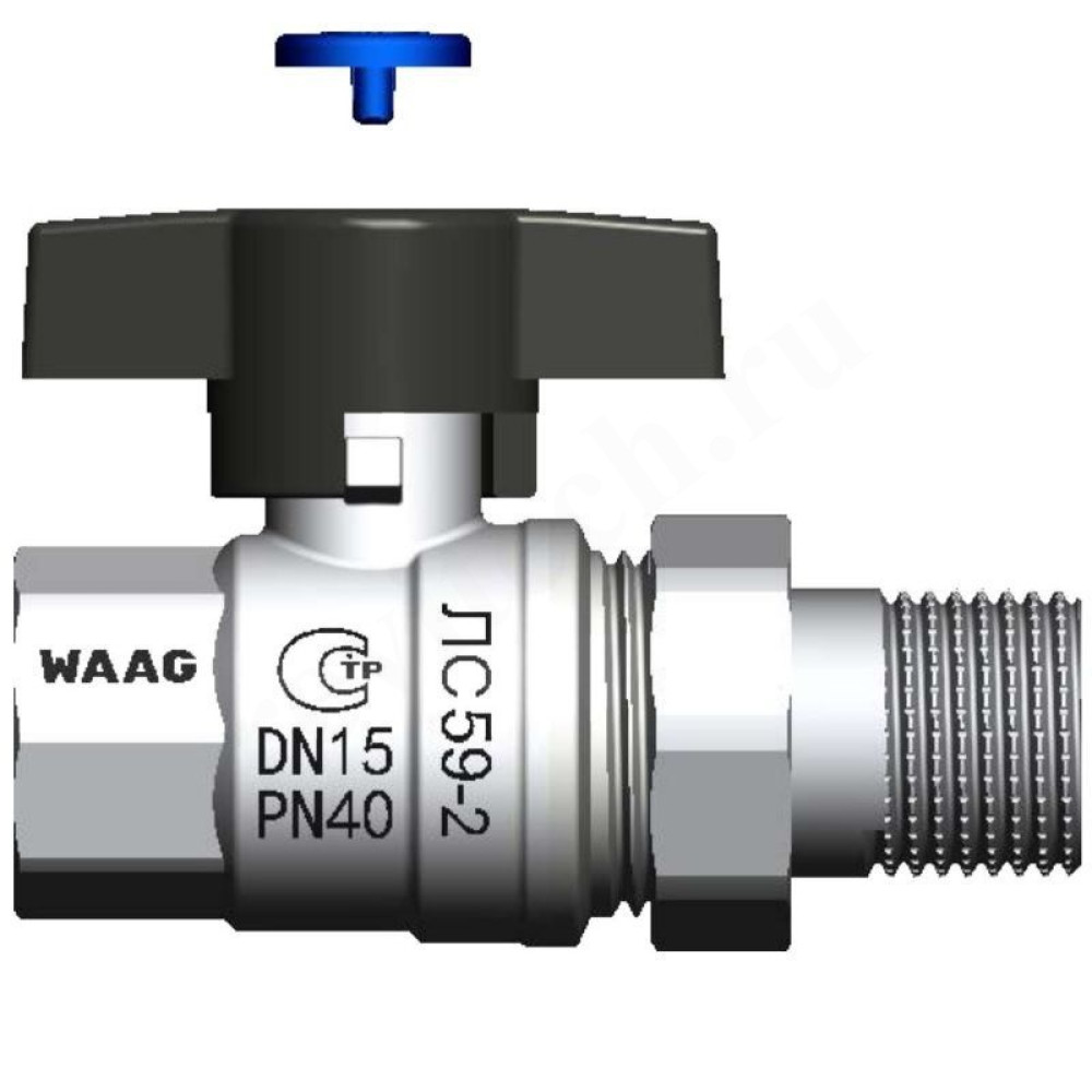 Полнопроходной запорный шаровой кран WAAG с американкой изготовлен из латуни CW617N. Никелированное покрытие защищает кран от коррозийных веществ. Кран имеет ручку типа «бабочка» из алюминиевого сплава.