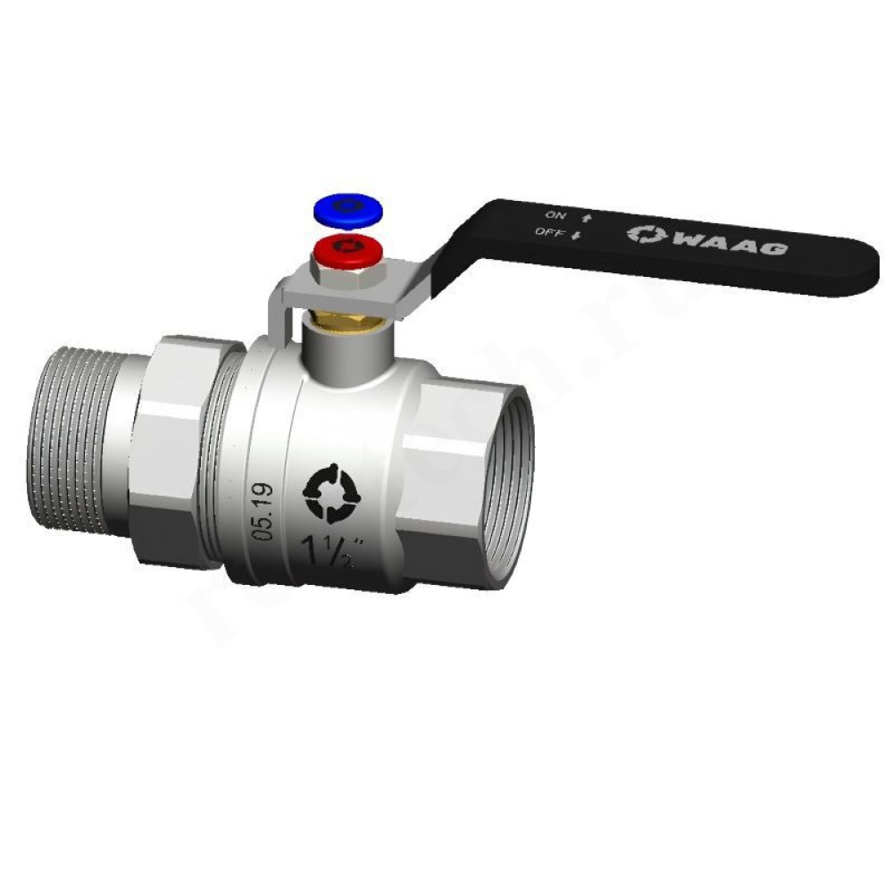 Полнопроходной запорный шаровой кран WAAG с американкой изготовлен из латуни CW617N. Никелированное покрытие защищает кран от коррозийных веществ. Кран имеет стальную ручку. Рабочая среда: вода, растворы гликолей (до 50%). Температура рабочей среды от -20 °C до 150 °C.