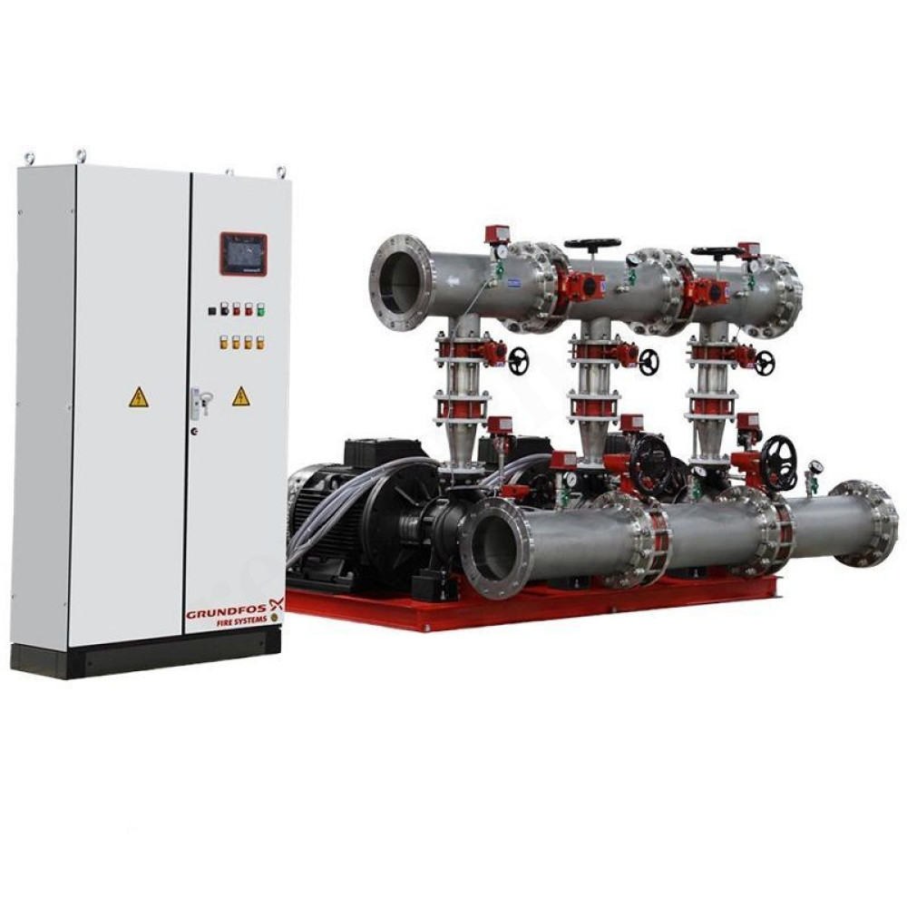 • 1 или 2 основных пожарных насоса Grundfos CR (вертикальный многоступенчатый) или NB (консольно-моноблочный)