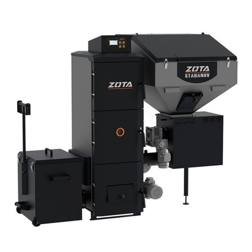 ZOTA Stahanov - автоматический угольный котел с лотковой горелкой, длительным горением до 8 суток, автоматической модуляцией мощности, системой реверса подающего шнека и пассивной безопасностью. Изготовлен из стали, толщиной 5 мм.
