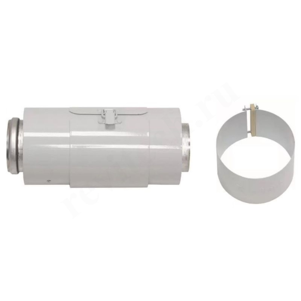 Поставляется в комплекте с соединительным хомутом, а так же имеет специальное отверстие для осмотра и чистки.