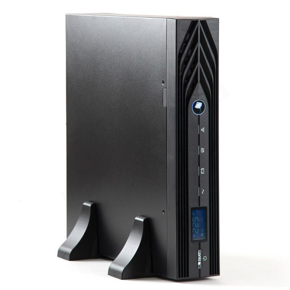Источник бесперебойного питания SKAT-UPS 1000 RACK. Изделие может быть использовано для питания компьютеров и вычислительных сетей, используемых, в частности: в средствах связи и сетях электроснабжения, в образовательной, финансовой и транспортной сфере, в структуре государственной безопасности, в научно-исследовательских центрах, а также для электропитания другой ответственной нагрузки с номинальным напряжением питания 220 В переменного тока и потребляемой мощностью до 1000 ВА. Online, синусоидальная форма выходного напряжения, световая и звуковая индикация режимов работы, ЖК-дисплей, необходимое кол-во АКБ для работы – 2 шт. (24 В) ёмкостью 40–120 Ач. Ток заряда АКБ – 6 А. Дистанционный мониторинг по RS 232, USB, порт для платы релейного интерфейса. Возможность подключения SNMP-модуля DL 801. Функция удалённого аварийного отключения выходного напряжения (EPO). Корпус под 19" шкаф, высота 2U или настольная установка.