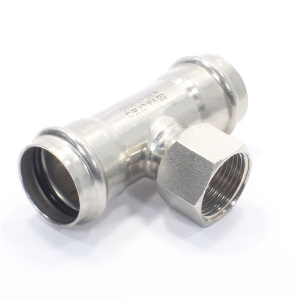 Пресс-тройник из нержавеющей стали с внутренней резьбой предназначен для соединения тонкостенных стальных труб с резьбовым элементом системы водоснабжения, отопления, других инженерных и технологических установок. Фитинг рассчитан на эксплуатацию при максимальной рабочей температуре 120 °С. Номинальное давление – 16 бар.