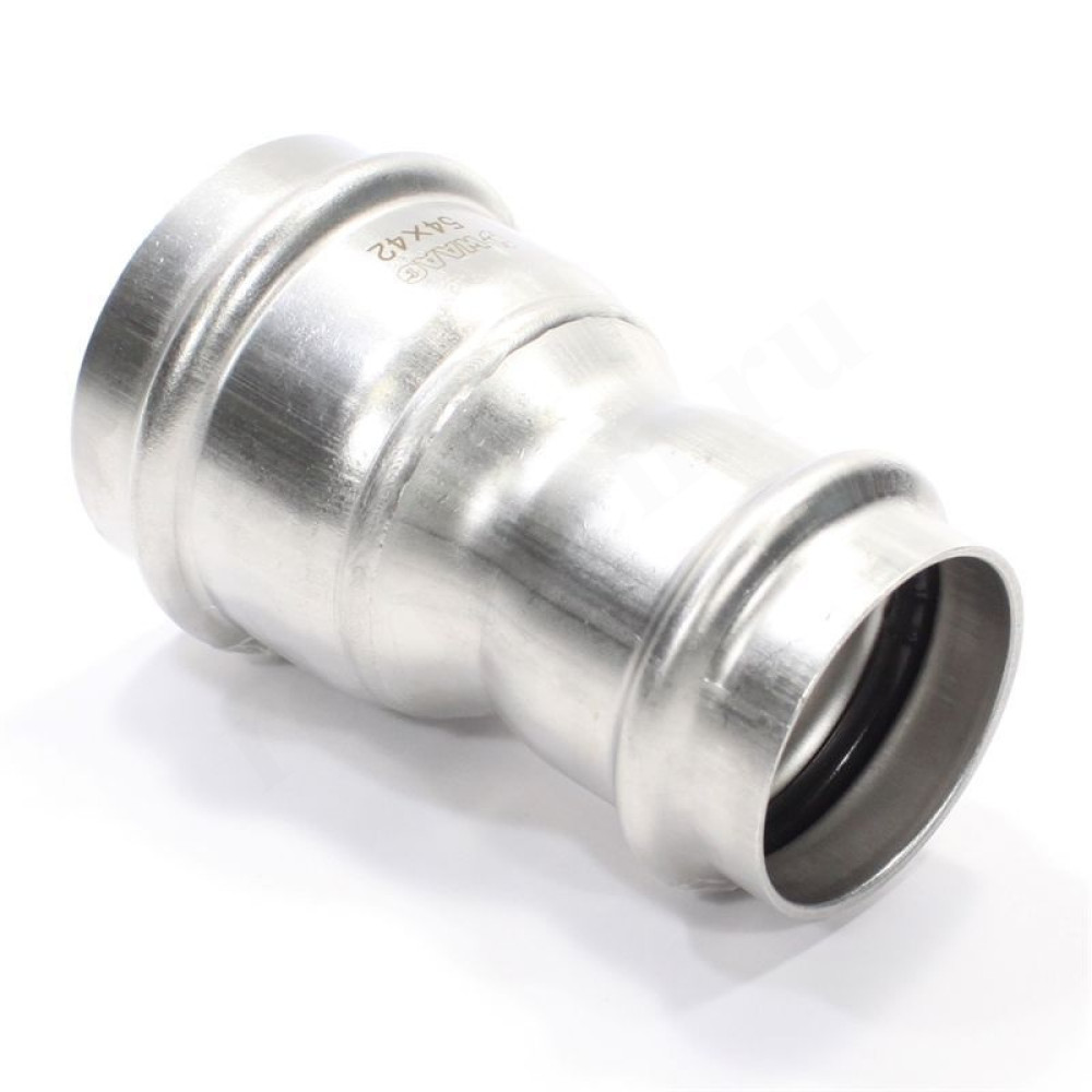 Двухраструбная пресс-муфта из нержавеющей стали предназначена для соединения тонкостенных стальных труб в системах водоснабжения, отопления, других инженерных и технологических установках с рабочей температурой до 120 °С. Номинальное давление – 16 бар.