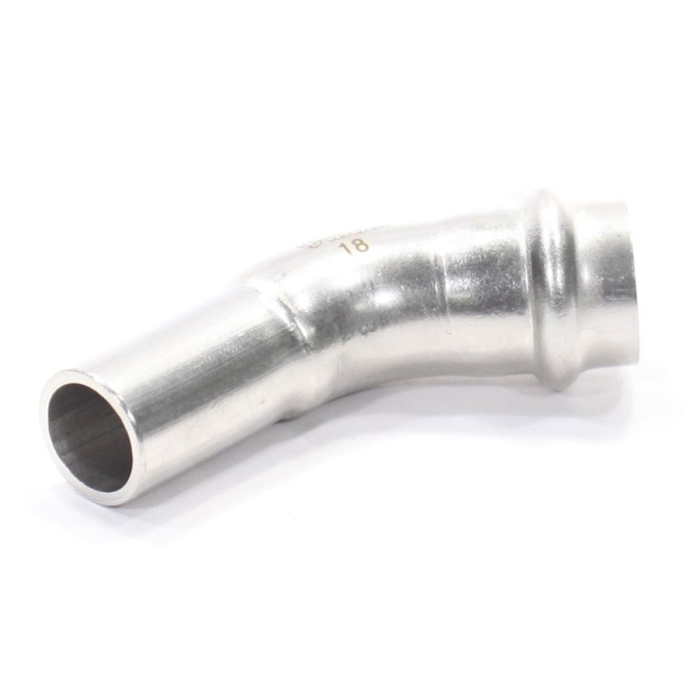 Однораструбный пресс-угольник 45° из нержавеющей стали обеспечивает соединение тонкостенных стальных труб систем водоснабжения, отопления, иных инженерных и технологических установок с рабочей температурой до 120 °С и давлением до 16 бар.