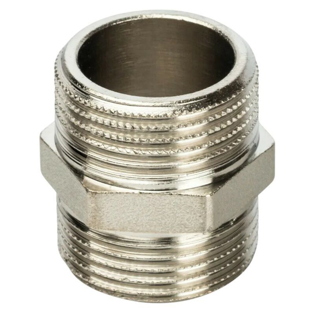 Латунный никелированный фитинг для соединения элементов трубопровода равного диаметра. Резьба – наружная/наружная. Предусмотрен участок корпуса шестигранной формы, под гаечный ключ.