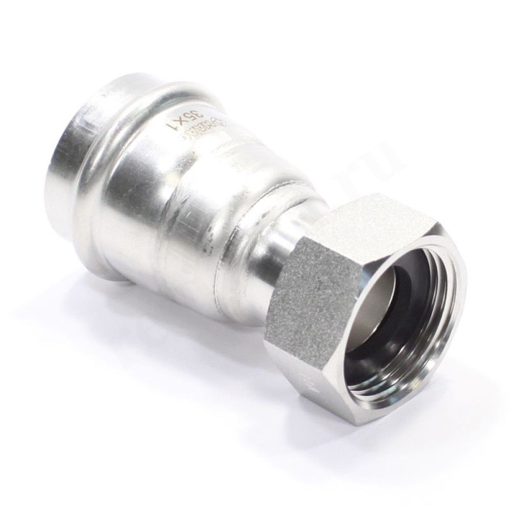 Пресс-соединение – бесштуцерное. Обжатие производится с помощью пресс-инструмента V-профиля. Накидная гайка комплектуется прокладкой.