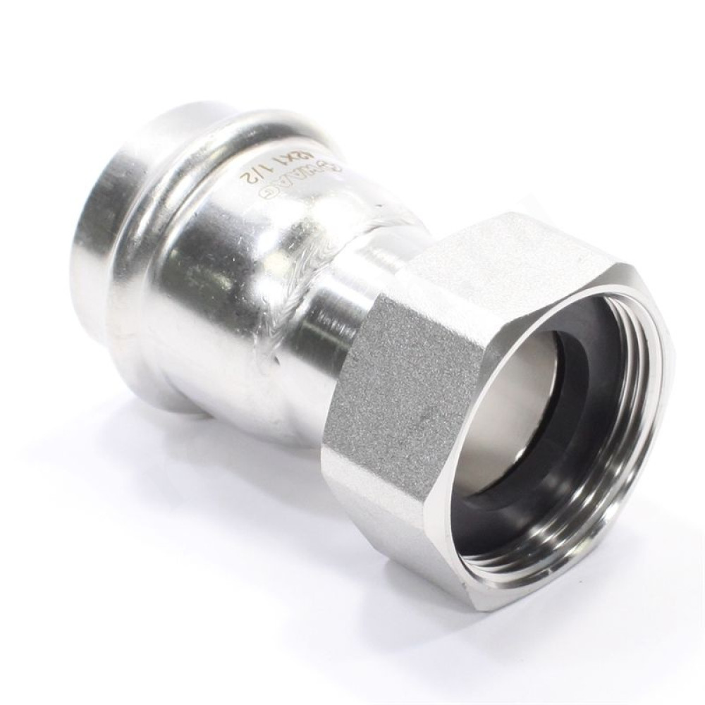 Пресс-фитинг из нержавеющей стали с накидной гайкой обеспечивает соединение тонкостенной стальной трубы c элементом системы, имеющим наружную резьбу. Область применения – трубопроводы водоснабжения, отопления, иные инженерные и технологические установки с рабочей температурой до 120 °С и давлением до 16 бар.