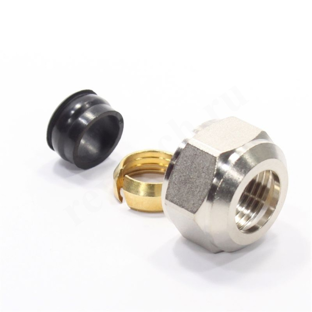 Комплектация: покрытая латунная гайка, встроенное латунное зажимное кольцо и уплотнительный конус из EPDM. Оребренная гайка под гаечный ключ 27.